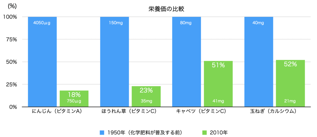 根を長く張り、栄養を土からのみ吸収するため、成長はゆっくりで時間はかかりますが、自然農で育まれた野菜の栄養価は化学肥料で作られている野菜の2倍〜3倍以上となります。